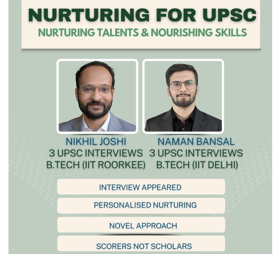 Nurturing for UPSC(NFU) is the brainchild of IITians, Naman Bansal & Nikhil Joshi, who have experienced multiple UPSC CSE & IFoS Exam Interviews (2021-24). NFU aims to nurture UPSC Aspirants for CSE and IFoS exams and share expertise of clearing Prelims and Mains Examination consistently and smoothly. NFU focuses on nurturing the skill of planning Time, Effort and Resources in Pareto Optimised manner amongst the youth.